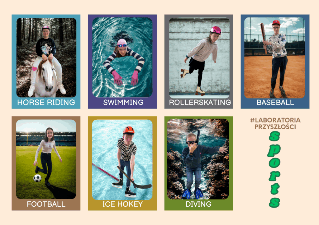 Uczniowie klasy 8a podczas lekcji z języka angielskiego poznali słownictwo związane z dyscyplinami sportu. Stworzyli także fiszki językowe z wybranymi nazwami sportów korzystając z pomocy Sztucznej Inteligencji.