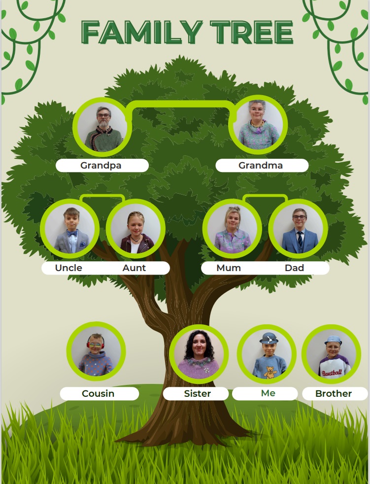 Uczniowie klasy 4a SP łącząc działania z Laboratoriów Przyszłości oraz projektu edukacyjnego Tworzę I Korzystam wykonali zdjęcia aparatem Sony i stworzyli drzewo genealogiczne korzystając z programu Canva z nazwami członków rodziny w języku angielskim.